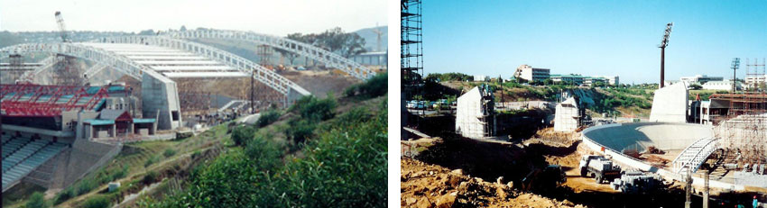 Four buttresses were built on either side of the track. Steel arches spanned with a one hundred and twenty metre roof spanned between the arches.